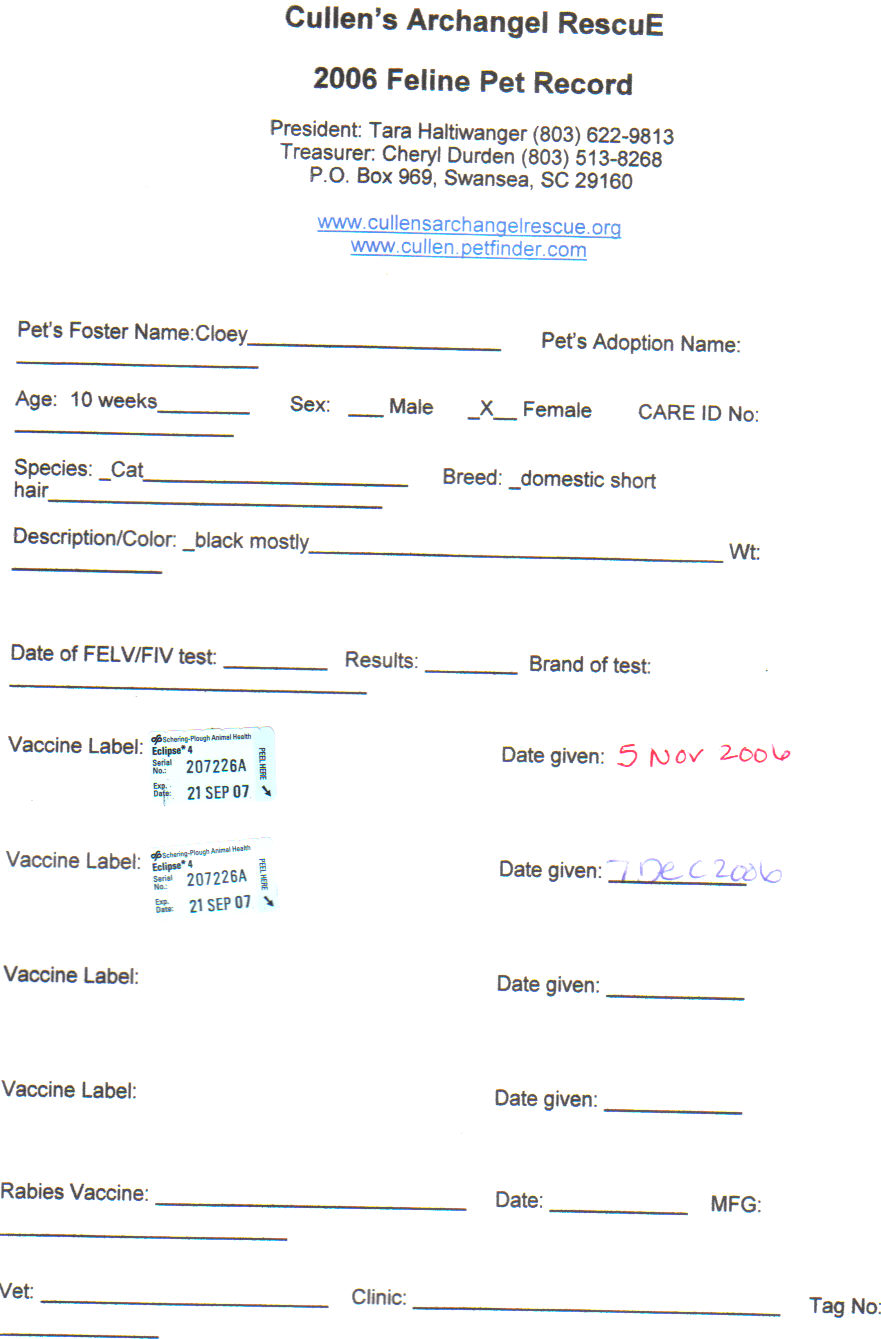 Cloey (all black) was born 8/27/06. She was one of many kittens found in a apartment complex. Cloey is scared of people. She currently lives in a house with other animals, but would do great as a barn cat. She is house trained, vaccinated, spayed, and has been dewormed. If you're looking for a barn cat, please email us. *****CARE does not have a physical shelter. We foster these animals in our private homes. We are usually unable to return calls during the week due to our full schedules with work, family and the animals we care for. Please email us an Adoption Form if you are interested in this pet and we'll be happy to get the ball rolling. Pets are shown by appointment after completed adoption forms are received and approved.More about Cloey (Barn Cat)Good with Dogs, Good with Cats, Is Not Good with Kids Sponsors: Adoption saves lives! Other Pictures of Cloey (Barn Cat) (click to see larger version):